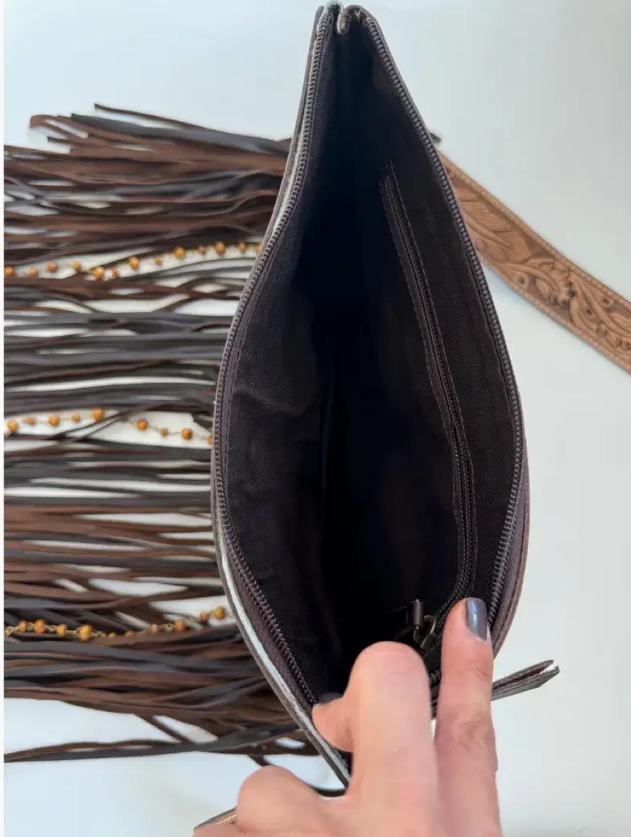 100% genuine leather 100% genuine cowhide beautiful hand tooled flower leather detail on front panel leather fringe Main compartment holds your keys, wallet, phone, makeup bag, etc. Zippered closure back of purse is all leather Inside: -zippered pocket strap is hand tooled leather and is 52” in length Strap is removable to use as a handbag/clutch 11 3/4 x 9" x 1” Strap is approximates 52" in length.