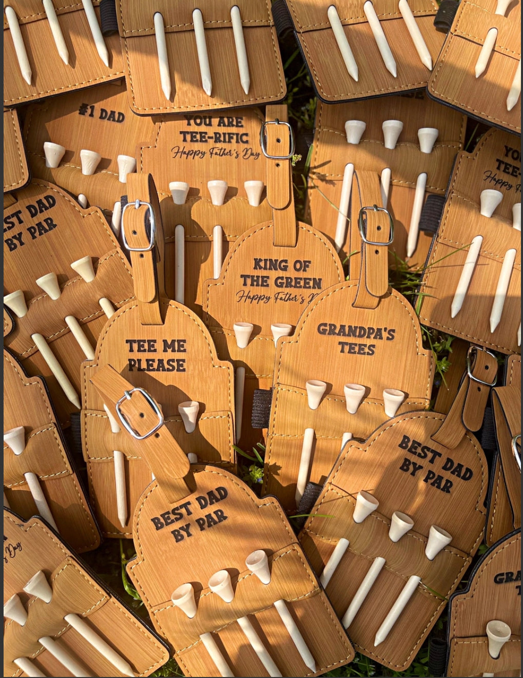 This custom golf tee bag attachment makes a perfect gift for the golfing man in your life. Crafted from leatherette and engraved with a personalized message to suit your needs, this 4" long attachment uses a buckle to secure to any golf bag and comes with a set of 3 golf tees. Show Dad you care and make sure he's always prepared!
