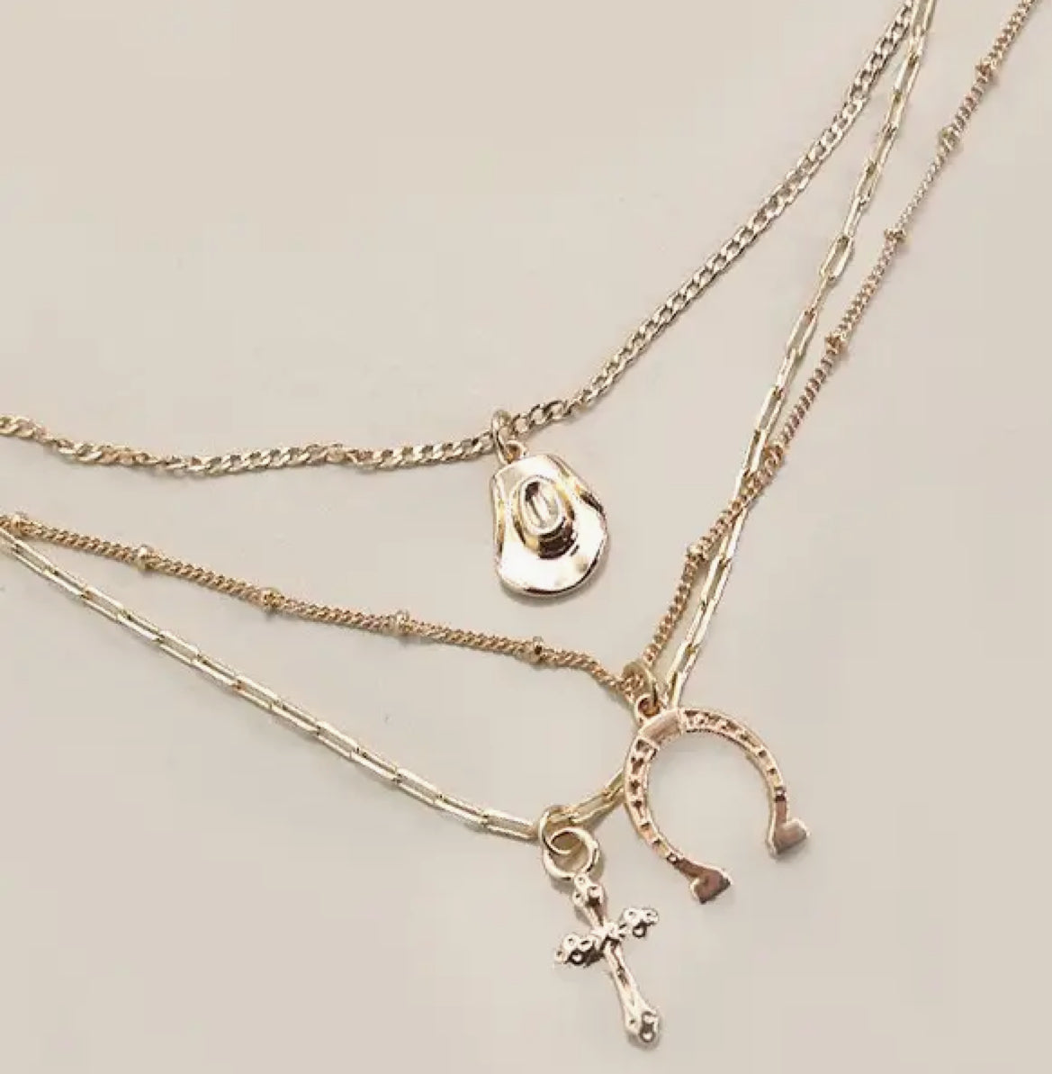 Trio Layer Horseshoe Hat Cross Charm Necklace, a stylish fusion of symbols that adds a unique flair to your jewelry collection. This necklace features three layers adorned with intricately designed horseshoe, hat, and cross charms, creating a trendy and eye-catching ensemble.